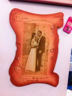 עבודת עץ צורת קלף עם תמונה בחריטה גודל 60/40
