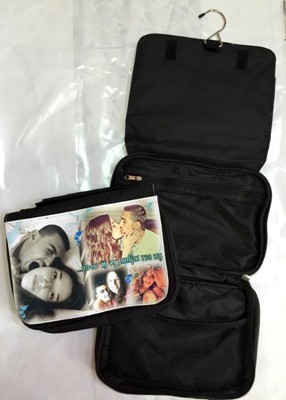 תיק רחצה שחור עם מקום להדפה ועם וו תליה למקלחת